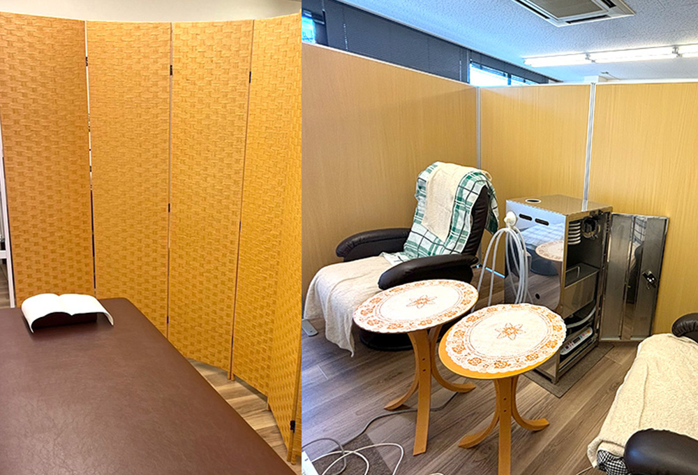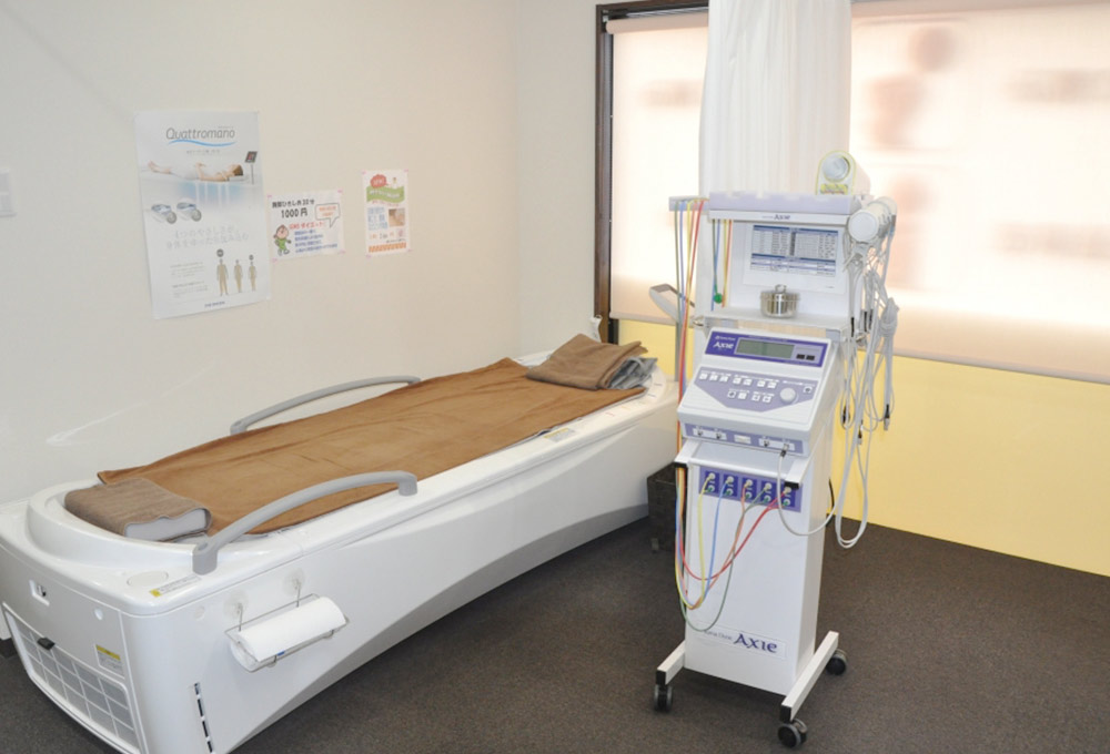 手技と鍼灸を中心に施術を行う鍼灸整骨院。膝・腰・肩など日常的な痛みや不調を扱っている。理学療法器も使用している。