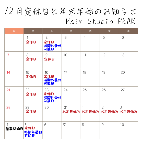 Hair Studio PEAR / 12月定休日と年末年始のお知らせ