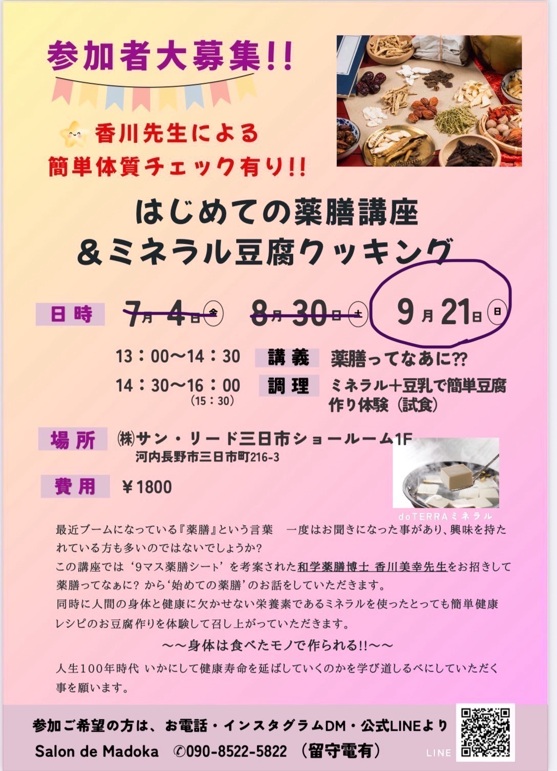 Salon de Madoka から、初めての薬膳講座&ミネラル豆腐クッキングのお知らせです。