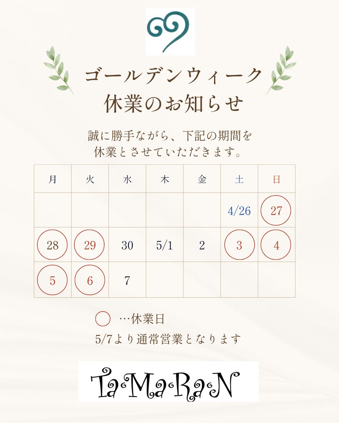 TaMaRaN / ゴールデンウィーク休業のお知らせ